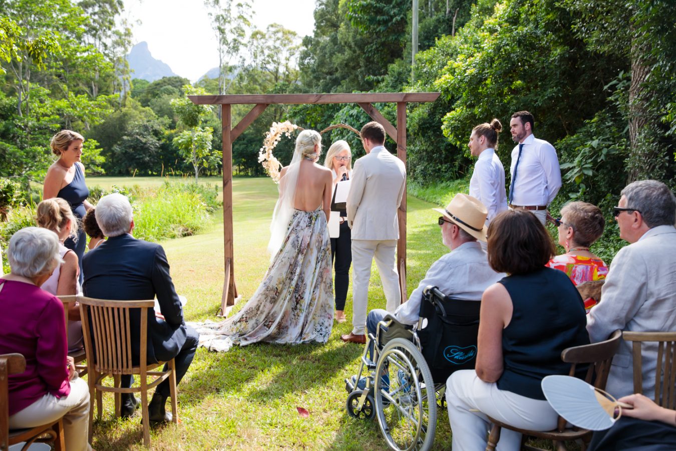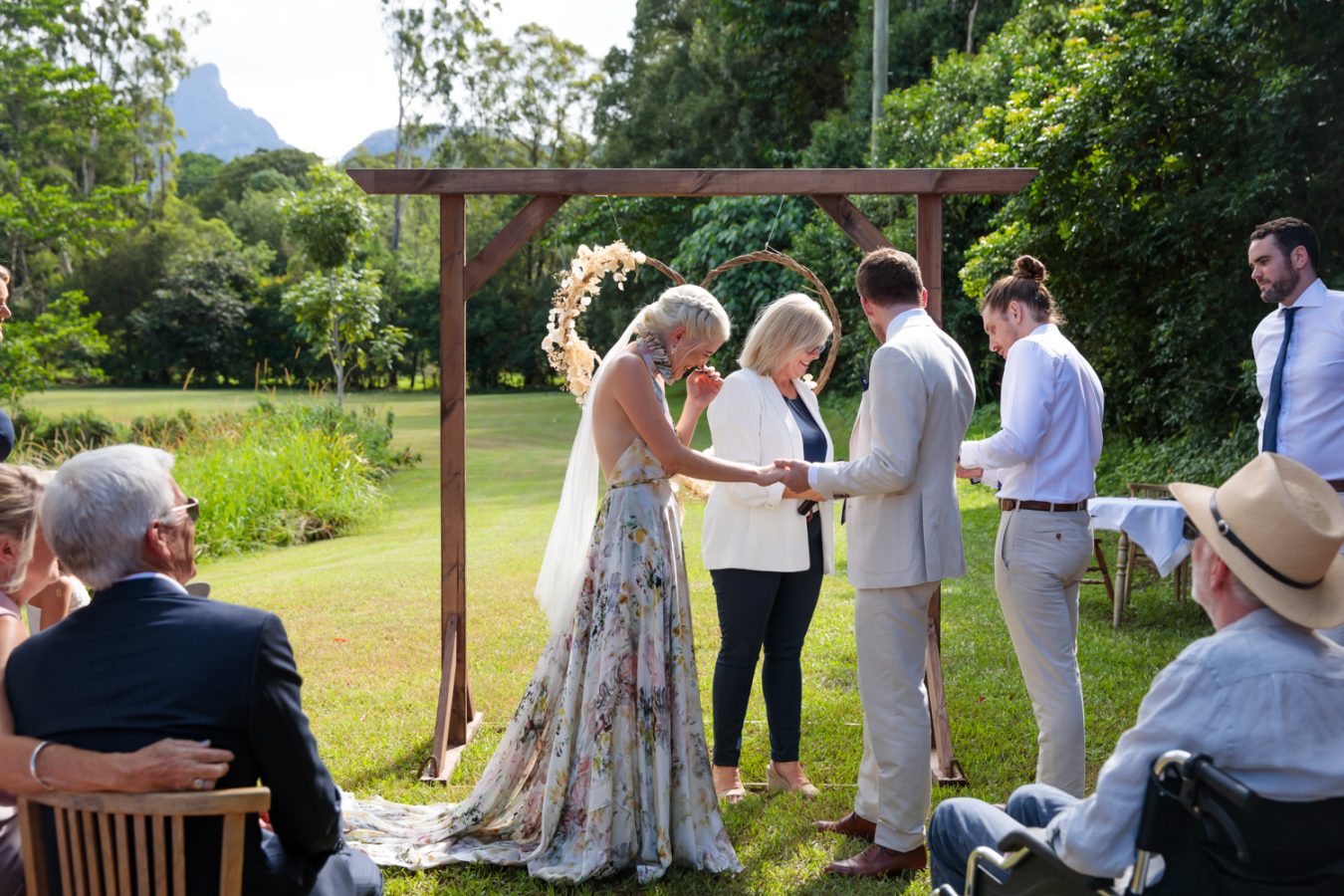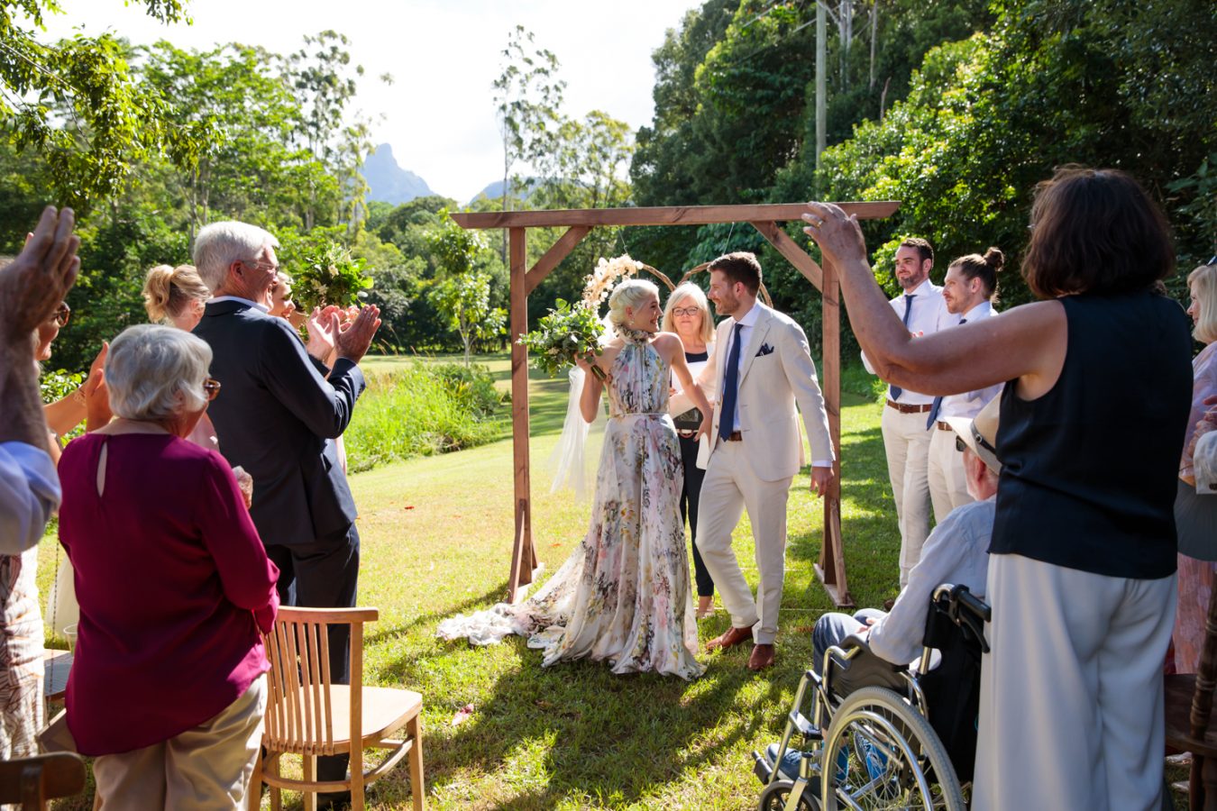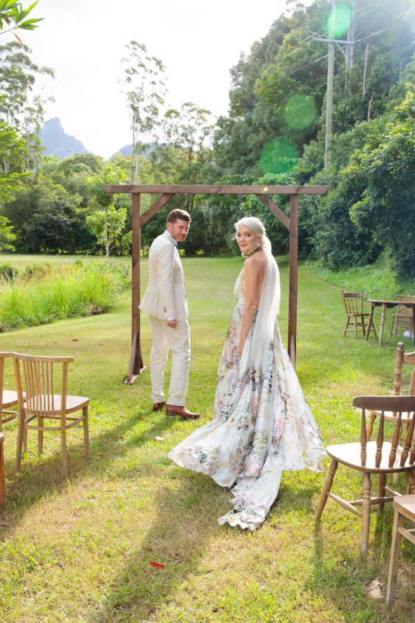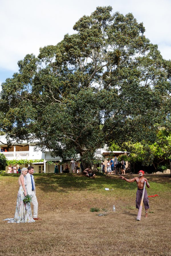 Loved ones ventured from near and far to gather in the gardens of Mavis’s Kitchen. The pair made their vows under the loving guidance of Liv’s aunty, in a perfectly framed setting at the foot of Woolumbin. In a special surprise, the mothers arranged a traditional smoking ceremony which honoured their formal union and guests were invited to join in the blessing.